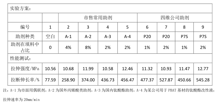将市面上常用可降解助剂与四维公司研发的助剂做对比实验,基材为PBAT,复合材料中钙含量为50%。