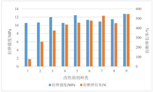 1、与空白样对比可知,市面上常用于可降解塑料的改性助剂具有一定的改性效果,其中钛酸酯改性液(A-4)改性效果最好;