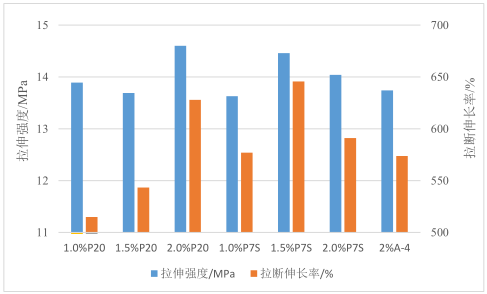 1、从上述实验测试数据可以看出,钙含量降低至40%时, P20、P7S改性复合材料的力学性能远远优于同等含量的钛酸酯改性液的改性效果,最大的拉伸强度可达14.60MPa、拉断伸长率可达627%。同等含量的几种助剂的改性效果依次为:P20>P7S>钛酸酯改性液。